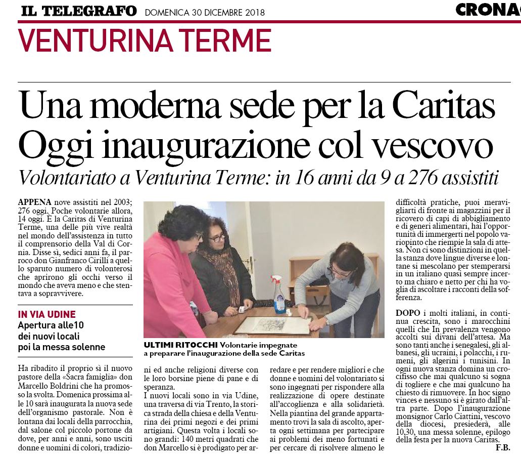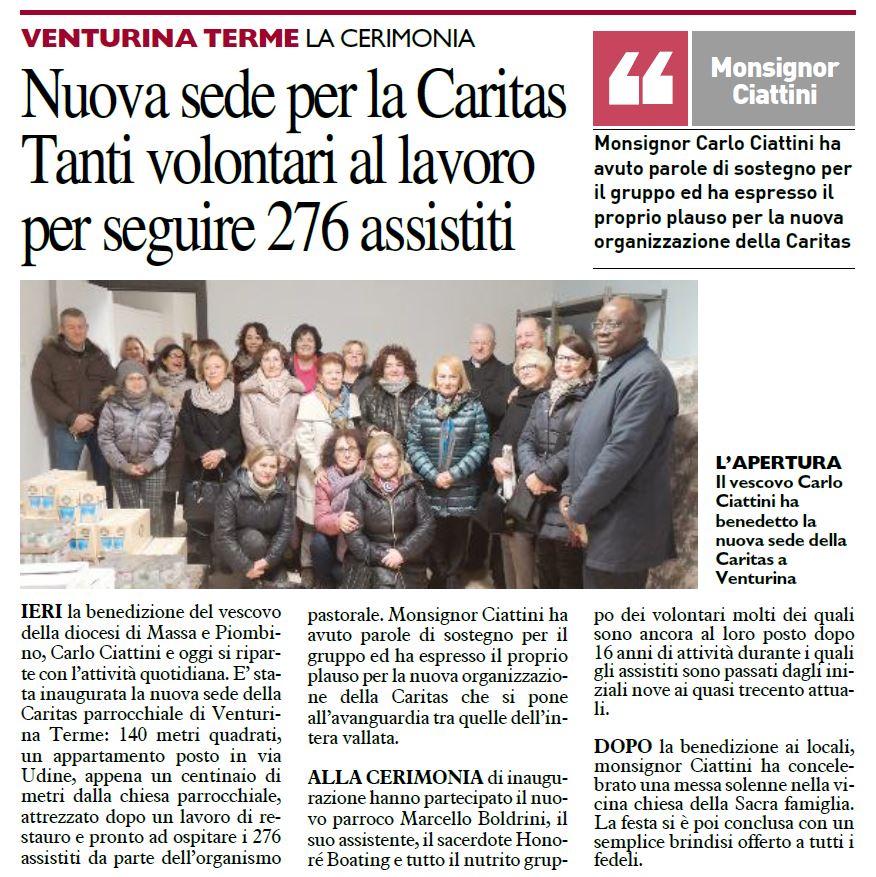 Domenica 30 dicembre, nella ricorrenza della festa liturgica della Santa Famiglia, con la benedizione del nostro Vescovo, mons Carlo Ciattini, è stata ufficialmente inaugurata la nuova sede della Caritas Parrocchiale. L'aumento di coloro che si rivolgono al Centro di Ascolto aveva da tempo segnalato la necessità di trovare nuovi spazi e provvidenzialmente questo trasferimento si è potuto realizzare. Il nuovo centro, in via Udine 4, occupa una superficie di 125 mq, opportunamente suddivisa in una sala di attesa, l'ufficio dove avvengono i colloqui e i locali per lo stoccaggio e la distribuzione dei generi alimentari e degli indumenti.